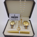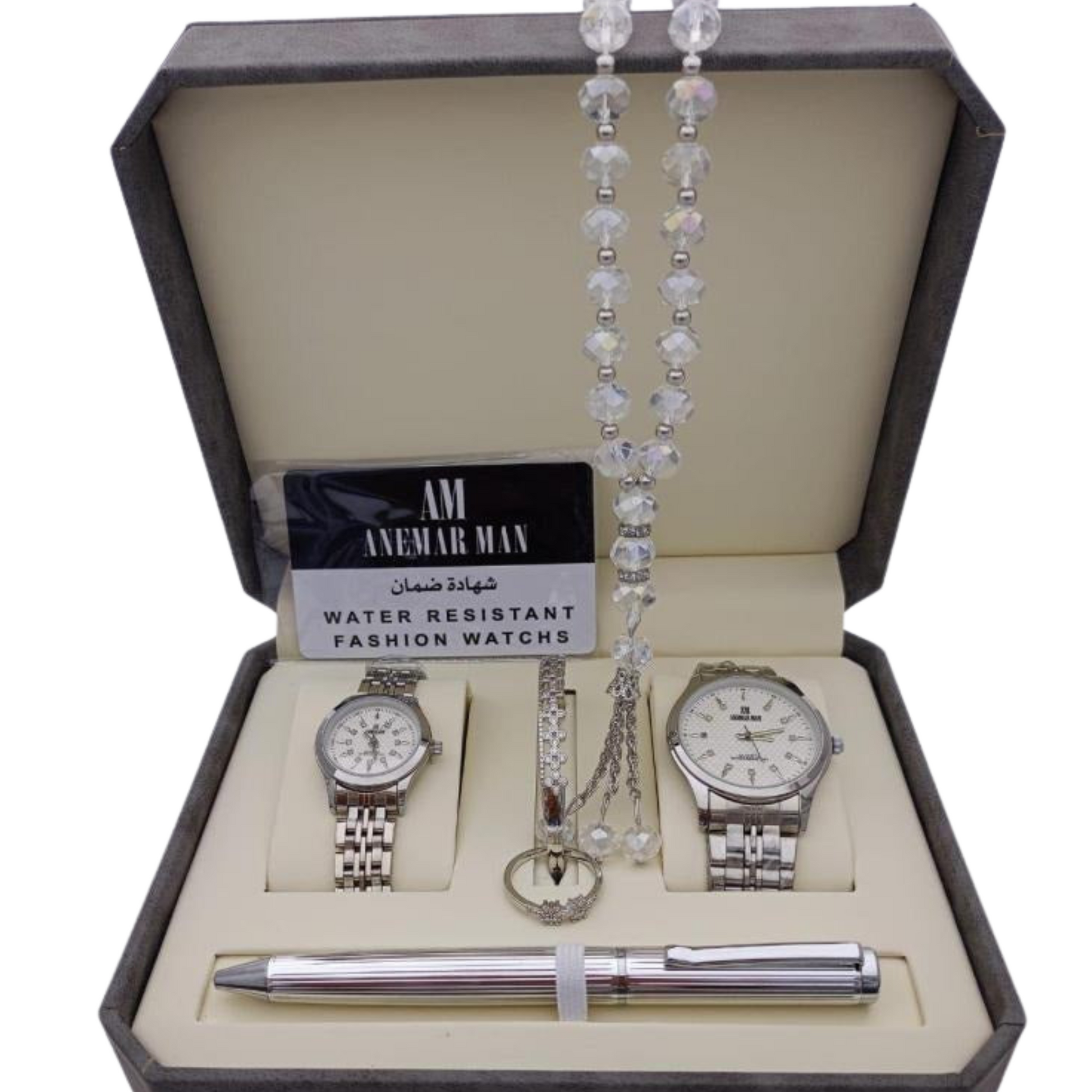 Elevate your style or surprise someone special with this luxurious stainless steel gift set. Thoughtfully curated for the modern gentleman, the set includes a sleek wristwatch, a stylish rosary (tasbih), an elegant pen, and classic cufflinks – all designed to complement both formal and casual looks.