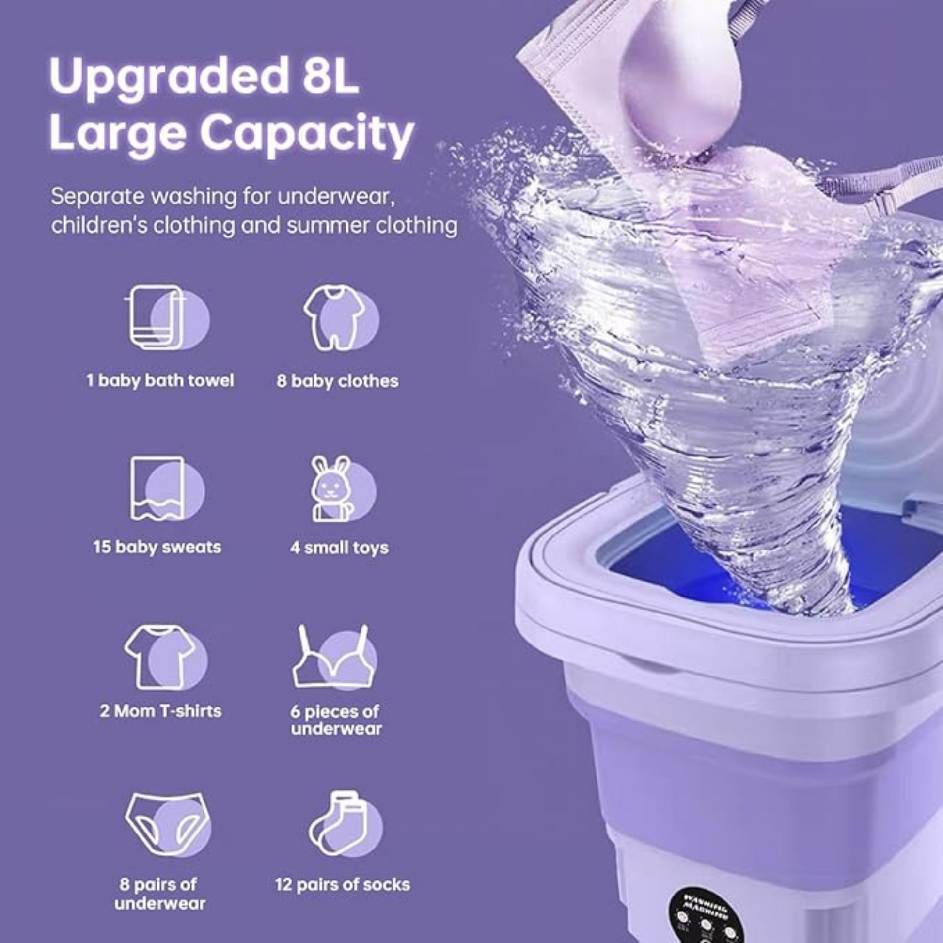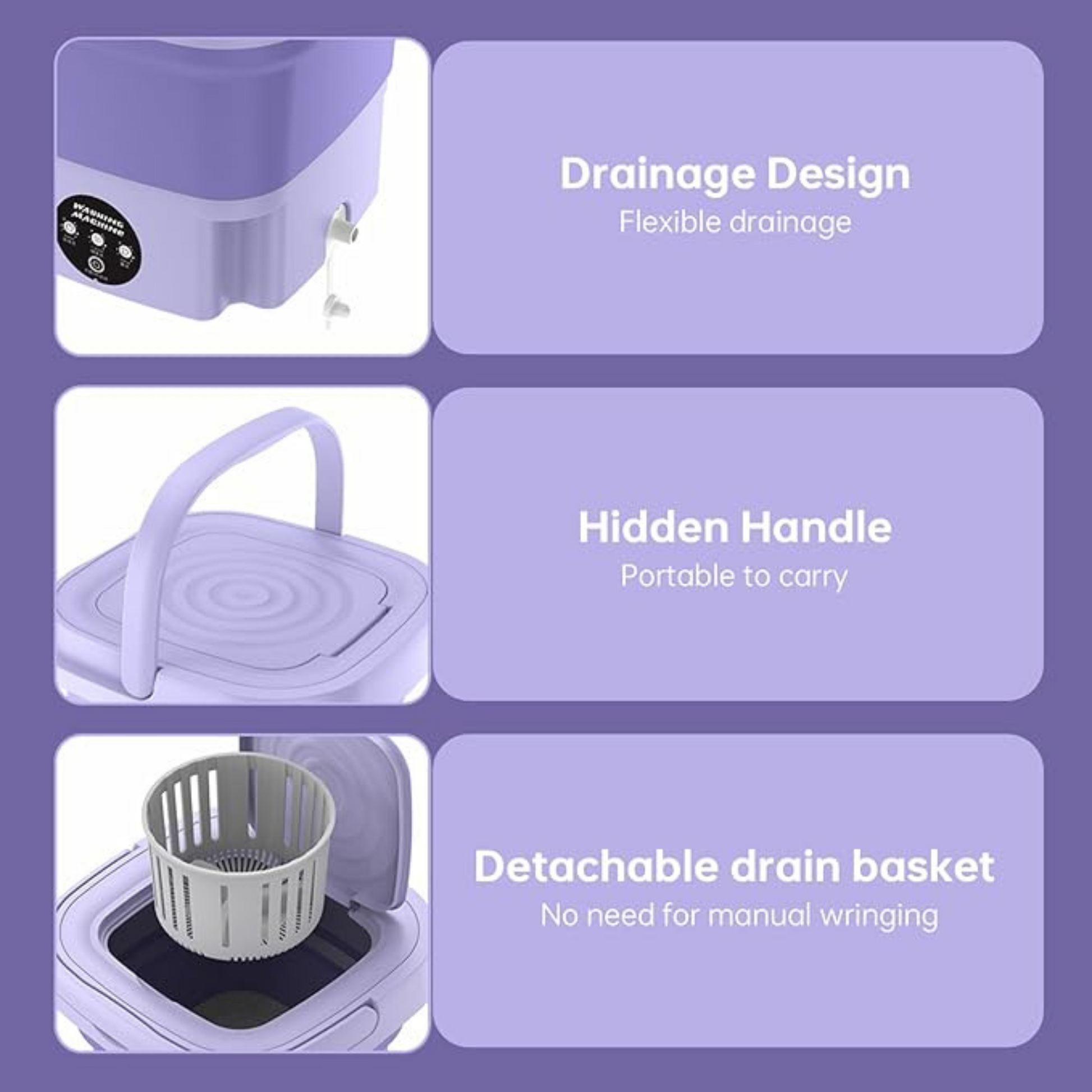 The Portable Washing Machine is designed for modern living, offering powerful cleaning in a lightweight, space-saving design. Perfect for apartments, dorms, travel, or quick daily laundry, it combines efficiency with convenience. With easy operation, low noise, and energy-saving performance, this mini washer is the ideal solution for effortless washing anytime, anywhere.